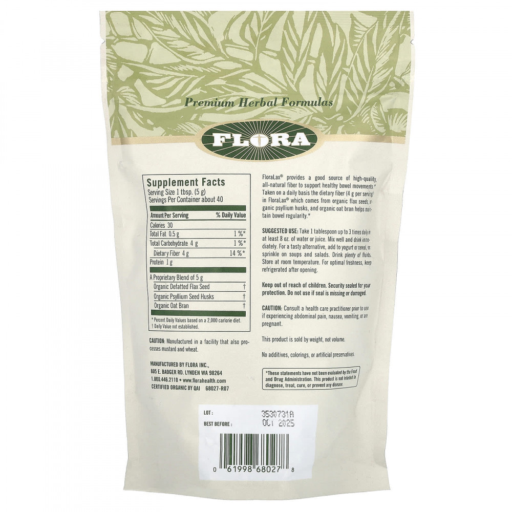 FloraLax® является хорошим источником высококачественной натуральной клетчатки, способствующей здоровой перистальтике кишечника. Ежедневный прием пищевой клетчатки (4 г на порцию) в составе FloraLax®, полученной из органических семян льна, органической шелухи подорожника и органических овсяных отрубей, помогает поддерживать регулярность стула.