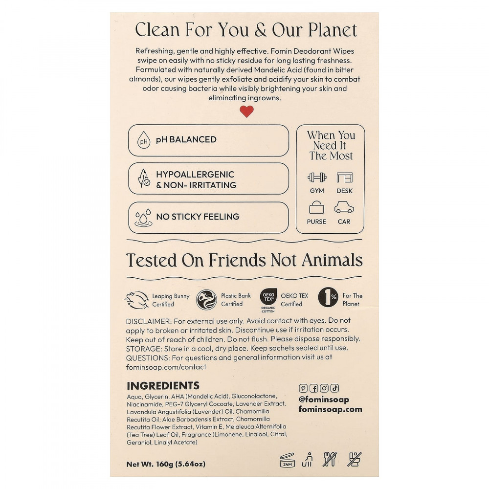 Освежающий, мягкий и высокоэффективный. Дезодорант-салфетки Fomin легко наносится, не оставляя липкости, и обеспечивает свежесть надолго. Наши салфетки, созданные на основе миндальной кислоты природного происхождения (полученной из горького миндаля), мягко отшелушивают и подкисляют кожу, борясь с бактериями, вызывающими неприятный запах, а также заметно осветляя кожу и устраняя вросшие.
