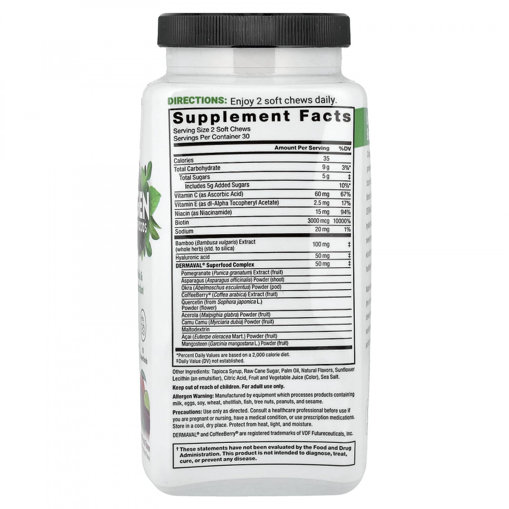 Суперфуды, повышающие уровень коллагена, - это эффективный способ повысить и защитить выработку естественного коллагена в организме. Каждая мягкая и сладкая жевательная таблетка, содержащая смесь клинически изученных питательных веществ, включая комплекс суперфудов DERMAVAL®, бамбук, биотин, гиалуроновую кислоту, а также витамины C и E, восстанавливает естественную эластичность вашей кожи, обеспечивая комплексную поддержку для здоровья волос, кожи и ногтей.