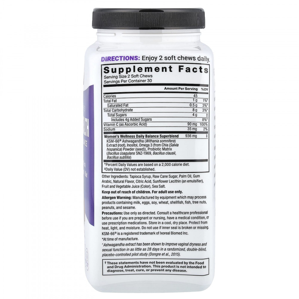 Каждая доза, содержащая три штамма и 5 млрд КОЕ* клинически изученных пробиотиков, а также ашваганду KSM-66®, поддерживает pH-баланс, влагалищную флору и гормональное здоровье. Добавьте две жевательные таблетки в свой ежедневный рацион, чтобы легче найти баланс, необходимый вашему организму.