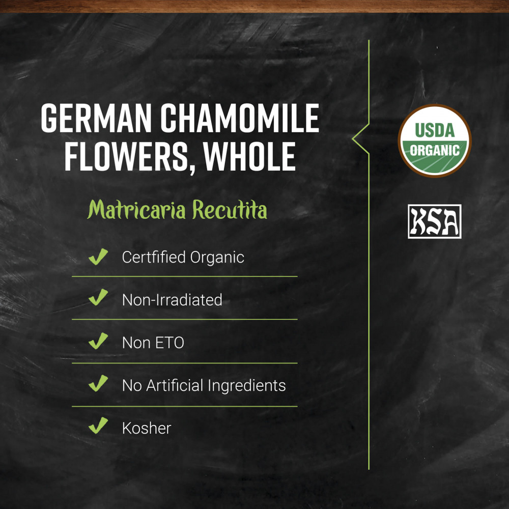 ВЫРАЩЕНО В ХОРВАТИИ ЭКОЛОГИЧНЫМ СПОСОБОМ. Наша высококачественная органическая немецкая ромашка тщательно собирается в Хорватии. Цветы собирают, когда они полностью раскрыты, чтобы добиться наилучших результатов. Цветы срезают в засушливые периоды, чтобы защитить их от появления плесени во время сушки. Эти цветки не подвергаются облучению и являются сертифицированным кошерным продуктом.