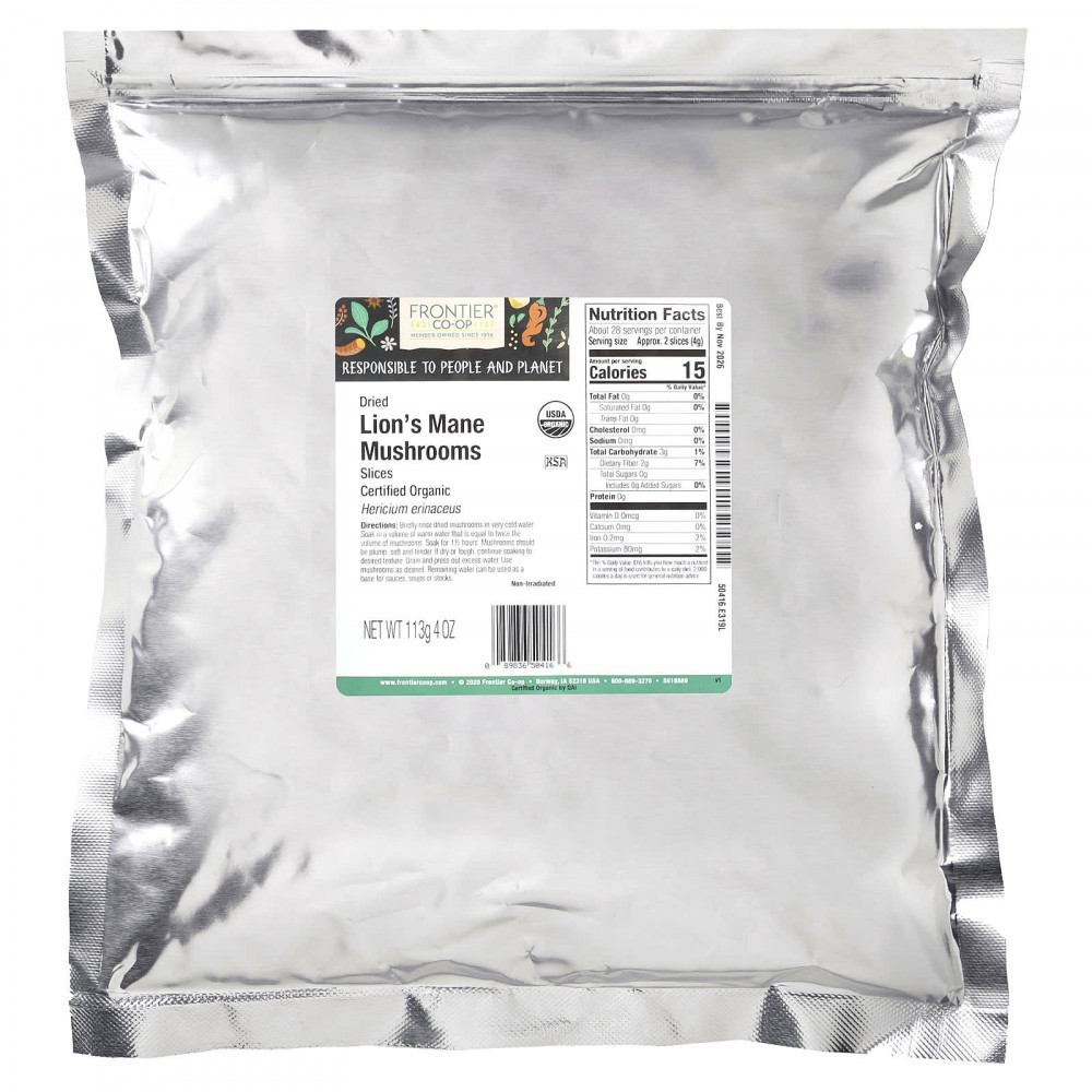 Ломтики сушеных грибов из гребешка Frontier Co-op® имеют сытный и крепкий вкус, а их сладкий и землистый вкус идеально подходят для замены мяса.
