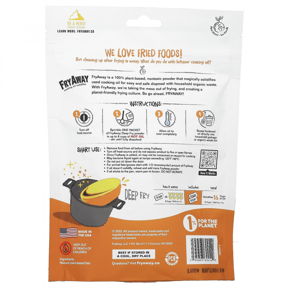 FryAway — это нетоксичный порошок на 100% растительного происхождения, который волшебным образом отвердает использованное растительное масло для легкой и безопасной утилизации вместе с бытовыми органическими отходами. С FryAway мы избавляем вас от беспорядка и создаем экологически безопасную культуру жарки. Так что вперед, FRYAWAY!