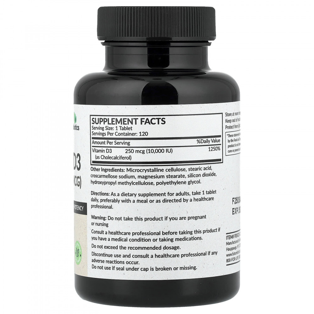 Витамин D3 от Futurebiotics содержит 10 000 МЕ витамина D3 в каждой таблетке. Поскольку витамин D естественным образом образуется в организме непосредственно под воздействием солнечного света, его уровень можно легко нарушить, если время, проводимое на свежем воздухе, ограничено. Витамин D3 от Futurebiotics содержит ту же форму витамина D, которую мы получаем от солнца, и помогает ежедневно восполнять запасы витамина D для поддержания хорошего самочувствия.