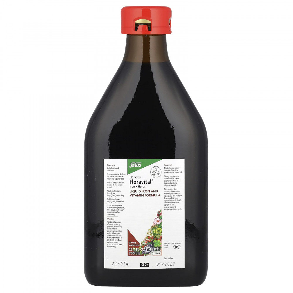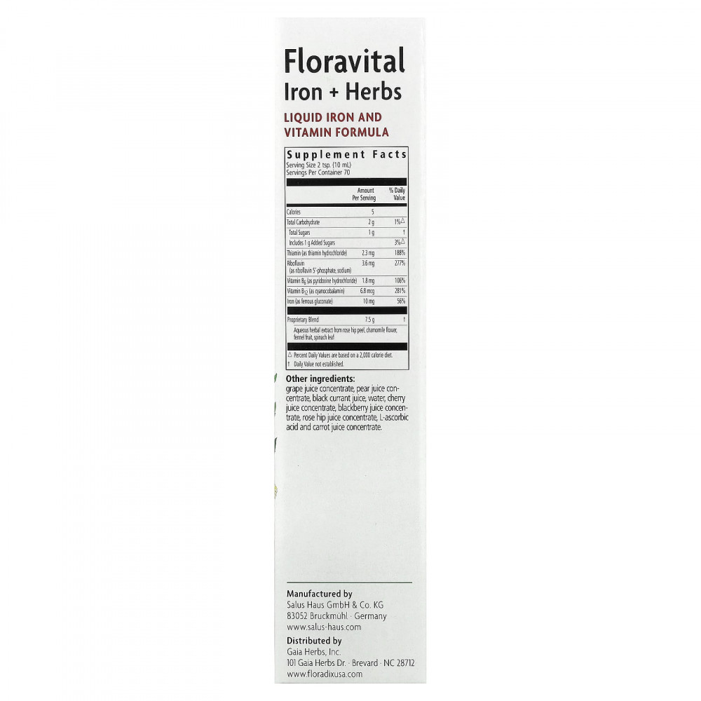 Floradix Floravital содержит железо из глюконата железа, витамин B1 (из гидрохлорида тиамина), витамин B2 (из 5'-фосфата рибофлавина, натрия), витамин B6 (из гидрохлорида пиридоксина) и витамин B12 (из цианокобаламина) для поддержания энергии.
