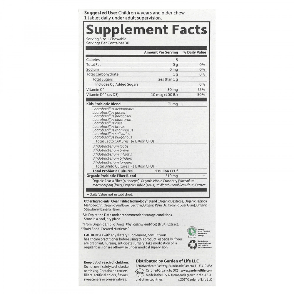 Компания Dr. Перлмуттер (Dr. Perlmutter) специально создал эту уникальную формулу для поддержки иммунной системы и пищеварения у детей. Эти жевательные таблетки получили сертификат USDA Organic как органический продукт, имеют прекрасный вкус и не содержат добавленного сахара.