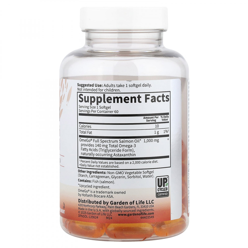 | Жир лосося полного спектра OmeGo®* содержит 140 мг омега-3 жирных кислот (в форме триглицеридов), натуральный астаксантин | 1000 мг | + |