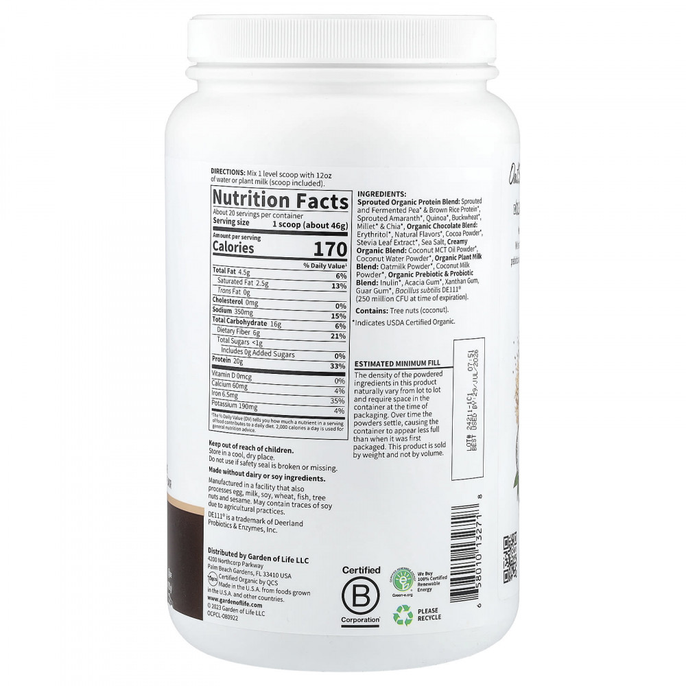 Протеиновая органическая смесь: пророщенный и ферментированный горох* протеин из коричневого риса*, пророщенный амарант*, киноа*, гречка*, просо* и и ч)иа*, органическая шоколадная смесь: эритритол*, натуральные ароматизаторы*, какао-порошок*, экстракт листьев стевии*, морская соль, органическая смесь в виде крема: порошок из кокосового масла MCT*, порошок из кокосовой воды, смесь органического растительного молока: сухое овсяное молоко*, порошок из кокосового молока*, органический пребиотик смесь пробиотиков: инулин*, аравийская камедь*, ксантановая камедь, гуаровая камедь*, сенная палочка (Bacillus subtilis) DE111® [250 млн КОЕ на момент истечения срока годности]).
