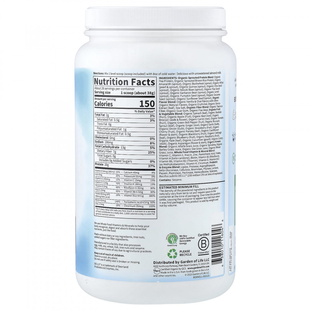 Органическая смесь пророщенных белков: органический гороховый белок, белок из органического проросшего бурого риса, органический амарант (ростки), органическая гречка (ростки), органическое просо (жемчужины и ростки), органическое киноа (ростки), органические семена чиа (ростки), органические ростки фасоли адзуки, органические семена льна (ростки), органические нут (ростки), органическая чечевица (ростки), органические семена тыквы (ростки), органические семена кунжута (ростки), органические семена подсолнечника (ростки), Смесь органических ароматизаторов: органические ароматизаторы "Ваниль и чай" и другие органические натуральные ароматизаторы, органический эритритол, экстракт листьев органической стевии, морская соль, Смесь органической клетчатки: органическая тапиоковая клетчатка, органическая гуаровая камедь, органическая льняная мука, Смесь органических фруктов и овощей: органический шпинат (листья), органические плоды баобаба, органическое яблоко (плод), органическая свекла (корнеплод), органическая брокколи (стебли и цветки), органическая морковь (корнеплод), органический томат (плод), органический зеленый болгарский перец (плоды), листья органической брюссельской капусты, корень органического имбиря, органический чеснок (луковица), органический лук (луковица), органическая клубника (плод), плоды органической вишни, листья органической петрушки, органическая цветная капуста (цветки и стебли), органическая ежевика (плод), листья органической капусты, органическая голубика (плод), органическая малина (плод), листья органической кудрявой капусты, органический огурец, стебель органического сельдерея, органическая спаржа (цветки и стебли), Смесь органической зелени: сок органических ростков люцерны, органическая спирулина, сок органических ростков ячменя, сок органического овса, сок органических ростков пшеницы, Смесь витаминов и минералов из цельных продуктов: витамин C, витамин E, ниацин, цинк, пантотеновая кислота, фолиевой кислоты, витамин А (бета-каротин), биотин, витамин B2 (рибофлавин), витамин B6, витамин B1 (тиамин), витамин D, витамин B12 (в виде метилкобаламина), витамин K, хрома, Смесь пробиотиков и ферментов: липаза, протеаза, аспергиллопепсин, бета-глюканаза, целлюлаза, бромелайн, фитаза, лактаза, папаин, пептидаза, пектиназа, гемицеллюлаза, ксиланаза, сенная палочка (Bacillus subtilis de111®) (250 млн КОЕ на момент истечения срока годности).