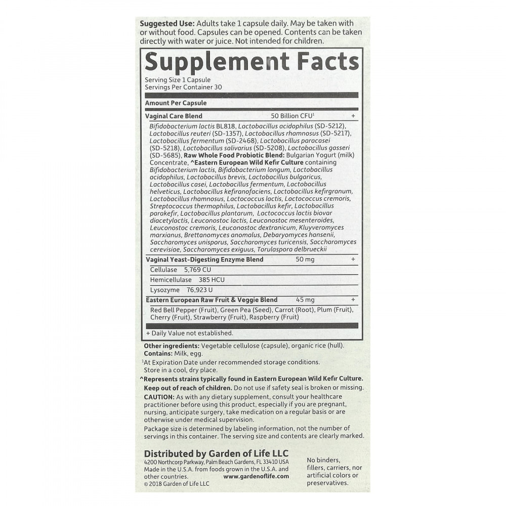 | Бифидобактерии лактис BL818, ацидофильные лактобактерии (SD-5212), лактобактерии реутери (SD-1357), лактобактерии рамнозус (SD-5217), лактобактерии ферментум (SD-2468), лактобактерии параказеи (SD-5218) ), Лактобактерии гассери (SD-5685), смесь пробиотиков из сырых цельных продуктов: Bulgarian Yogurt (milk) Concentrate, ^Eastern European Wild Kefir Culture containing Bifidobacterium lactis, Bifidobacterium longum, Lactobacillus acidophilus, Lactobacillus brevis, Lactobacillus bulgaricus, Lactobacillus casei, Lactobacillus fermentum, Lactobacillus helveticus, Lactobacillus kefiranofaciens, Lactobacillus kefirgranum, Lactobacillus rhamnosus, Lactococcus lactis, Lactococcus cremoris, Streptococcus thermophilus, Lactobacillus kefir, Lactobacillus parakefir, Lactobacillus plantarum, Lactococcus lactis biovar diacetylactis, Leuconostoc lactis, Leuconostoc mesenteroides, Leuconostoc cremoris, Leuconostoc dextranicum, Kluyveromyces marxianus, Brettanomyces anomalus, Debaryomyces hansenii, Saccharomyces unisporus, Saccharomyces turicensis, Saccharomyces cerevisiae, Сахаромицеты (Saccharomyces exiguus), Torulaspora delbrueckii | ||