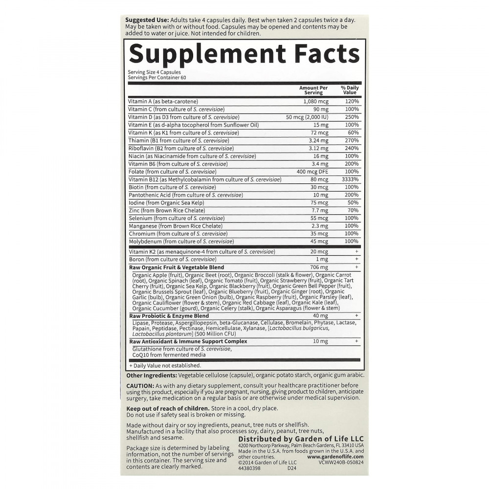 | Смесь органических фруктов и овощей RAW Органическое яблоко (плоды), органическая свекла (корень), органическая брокколи (стебель и цветы), органическая морковь (корень), органический шпинат (листья), органический томат (плоды), органическая клубника (плоды), органическая терпкая вишня (плоды) , Органические морские водоросли, органическая ежевика (плоды), органический зеленый перец (плоды), органическая брюссельская капуста (листья), органическая голубика (плоды), органический имбирь (корень), органический чеснок (луковица), органический зеленый лук (луковица) , Органическая малина (плоды), органическая петрушка (листья), органическая цветная капуста (цветки и стебли), органическая краснокочанная капуста (листья), органическая капуста (листья), органический огурец (тыква), органический сельдерей (стебель), органическая спаржа (цветки и с)тержень) | 706 мг | + |