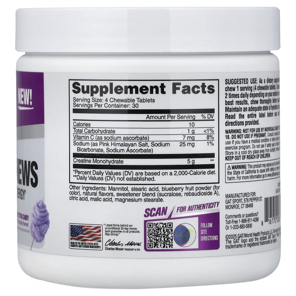 Жевательные таблетки с креатином GAT Sport обеспечивают эффективность чемпионского уровня в удобной жевательной таблетке.Каждая порция содержит 5 г моногидрата креатина премиального качества без сахара, потому что вам нужно больше энергии, а не калорий.