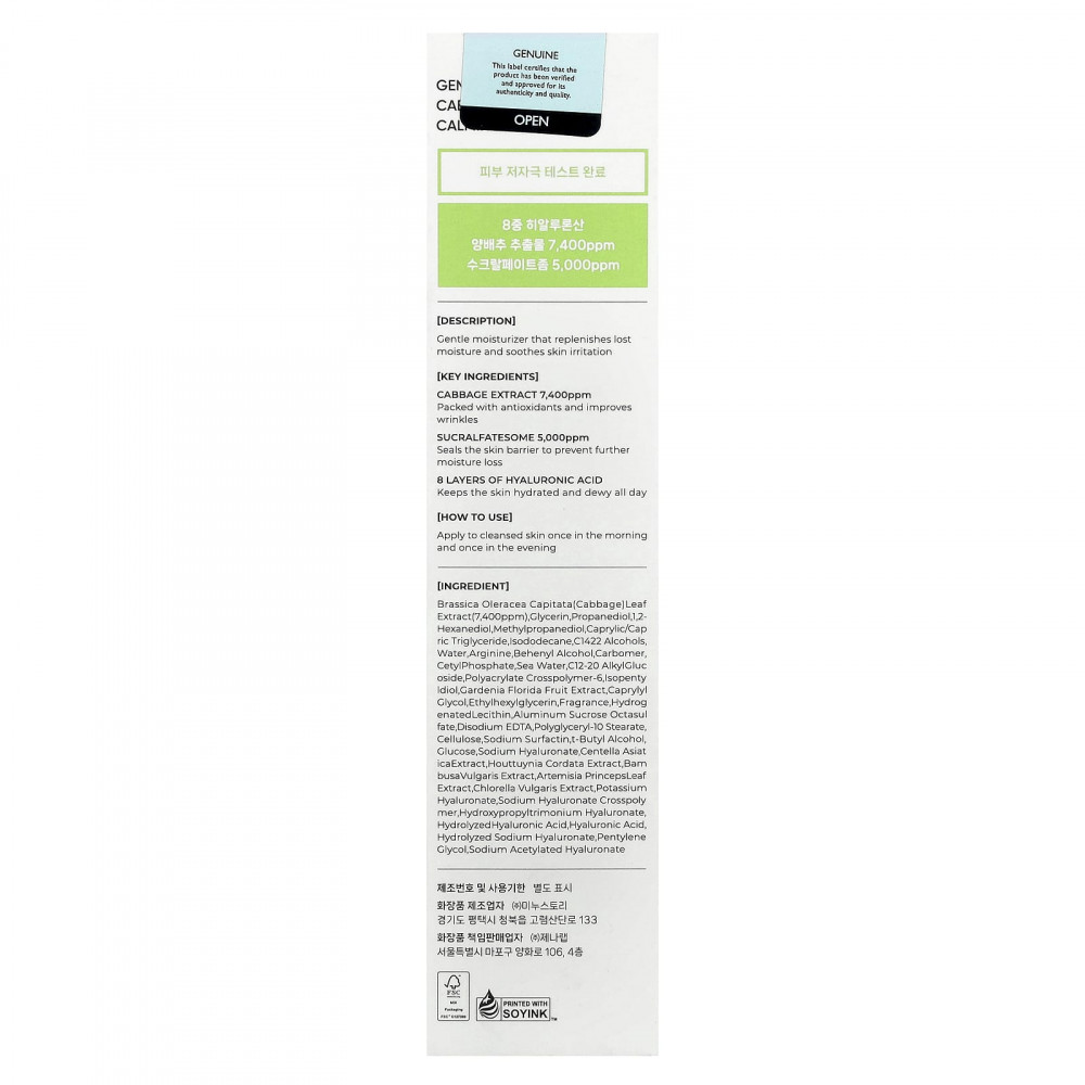 Экстракт листьев кочанной капусты (Brassica oleracea capitata) (7400 част. / Млн), глицерин, пропандиол, 1,2-гександиол, метилпропандиол, каприловый/каприновый триглицерид, изододекан, c1422 спирты, вода, аргинин, бегениловый спирт, карбомер, цетилфосфат, морская вода, c12-20 алкил глюкозид, полиакрилата кроссполимер-6, изопентидиол, экстракт плодов гардении жасминовидной (Gardenia florida), каприлилгликоль, этилгексилглицерин, отдушка, гидрогенизированный лецитин, октасульфат алюминия и сахарозы, двунатриевая ЭДТК, полиглицерил-10 стеарат, целлюлоза, сурфактин натрия, т-бутиловый спирт, глюкоза, гиалуронат натрия, экстракт готу колы (Centella asiatica), экстракт хауттюйнии (Houttuynia cordata), экстракт бамбука (Bambusa vulgaris), экстракт листьев полыни корейской (Artemisia princeps), экстракт хлореллы (Chlorella vulgaris), гиалуронат калия, кроссполимер гиалуроната натрия, гиалуронат гидроксипропилтримония, гидролизованная гиалуроновая кислота, гиалуроновая кислота, гидролизованный гиалуронат натрия, пентилен гликоль, ацетилированный гиалуронат натрия.