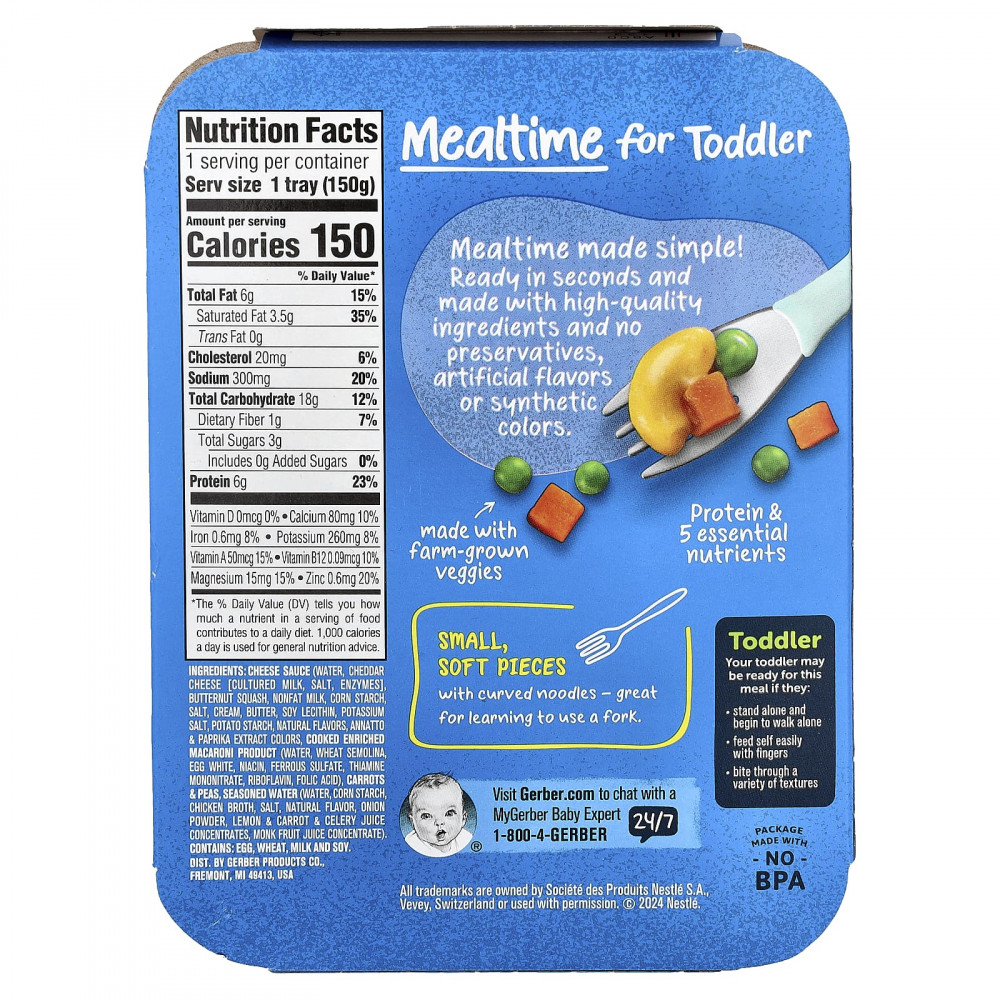 Сырный соус (вода, сыр чеддер [кисломолочный, соль, ферменты], мускатная тыква, обезжиренное молоко, кукурузный крахмал, соль, крем, сливочное масло, соевый лецитин, калийная соль, картофельный крахмал, натуральные ароматизаторы, annatto & amp; экстракт паприки краситель, приготовленные обогащенные макароны (вода, манная крупа, яичный белок, ниацин, сульфат железа, тиамина мононитрат, рибофлавин, фолиевая кислота), морковь и горох, выдержанная вода (вода, кукурузный крахмал, куриный бульон, соль, натуральный ароматизатор, луковый порошок, лимон и морковь и концентраты сока сельдерея, концентрат сока из плодов монаха).