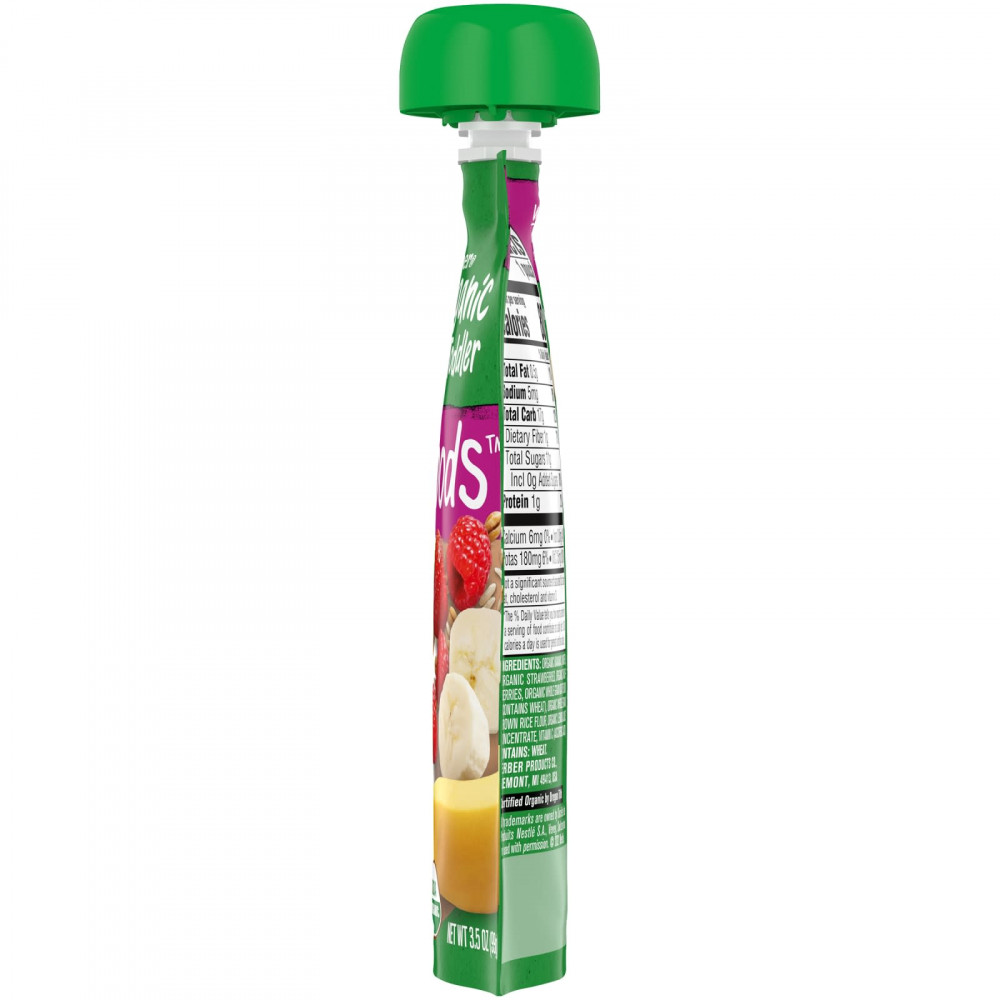 Органические бананы (концентрат органического бананового пюре, вода), вода, органическая клубника, органическая малина, органическая овсяная мука (содержит органическую пшеницу), мука из органического бурого риса, лимонная кислота, витамин С (аскорбиновая кислота).