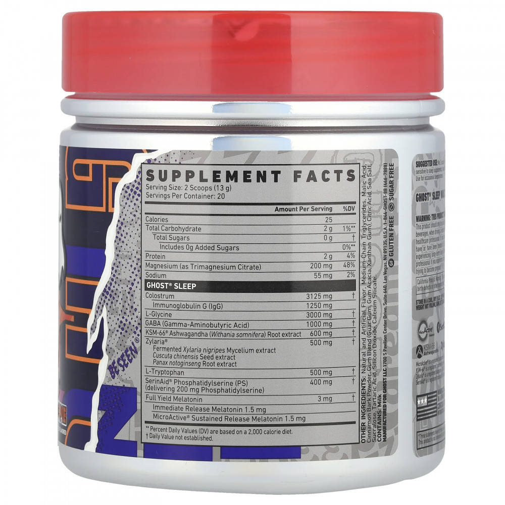 Смешайте 2 мерные ложки (1 порцию) GHOST® SLEEP с 6–8 унциями воды или напитка по выбору. Новым пользователям, а также тем, кто чувствителен к добавкам для сна, следует начать с 1/2 порции (1 мерная ложка), чтобы оценить свою переносимость. Принимать перед сном. Используйте при периодической бессоннице.