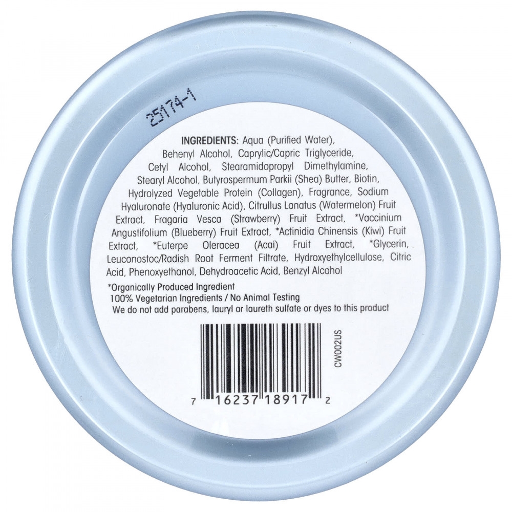 Очищенная вода, бегениловый спирт, каприловый/каприновый триглицерид, цетиловый спирт, стеарамидопропил диметиламин, стеариловый спирт, Масло Butyrospermum parkii (Ши), биотин, гидролизованный растительный белок (коллаген), аромат, гиалуронат натрия (гиалуроновая кислота), экстракт арбуза (Citrullus lanatus), экстракт клубники (Fragaria vesca), экстракт ягод голубики (Vaccinium angustifolium)*, экстракт плодов киви (Actinidia chinensis)*, экстракт ягод асаи (Euterpe oleracea), глицерин*, лейконосток/ферментированный фильтрат корня редиса, гидроксиэтилцеллюлоза, лимонная кислота, феноксиэтанол, дегидроуксусная кислота, бензиловый спирт.
