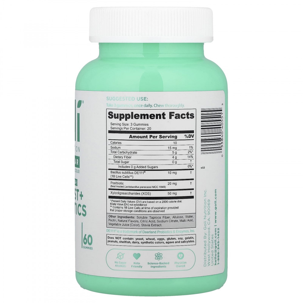 Знаете ли вы, что ~ 70% иммунной системы человека находится в кишечнике? Когда дело доходит до здоровья кишечника, Goli® упростил для вас заботу о здоровье кишечника. Встречайте первые в мире жевательные мармеладки «3 в 1» с добавлением пробиотиков, теперь без сахара! Если вам интересно, что все это значит, мы упростим его переваривание: пребиотики обеспечивают топливо для пробиотиков, которые помогают поддерживать здоровье пищеварительной системы. Постбиотики - это стабильные штаммы бактерий, обеспечивающие иммунную поддержку. Впервые вместе в вкусной жевательной мармеладке? Это смелый шаг, который стоит отметить!