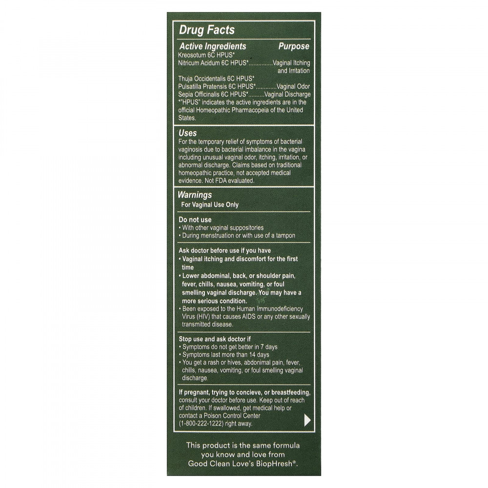 Назначение : для временного облегчения симптомов бактериального вагиноза, вызванных бактериальным дисбалансом во влагалище, включая необычный запах из влагалища, зуд, раздражение или обильные выделения. Данные заявления основаны на опыте применения гомеопатических средств, а не данных официального медицинского заключения. Утверждение не было оценено FDA.