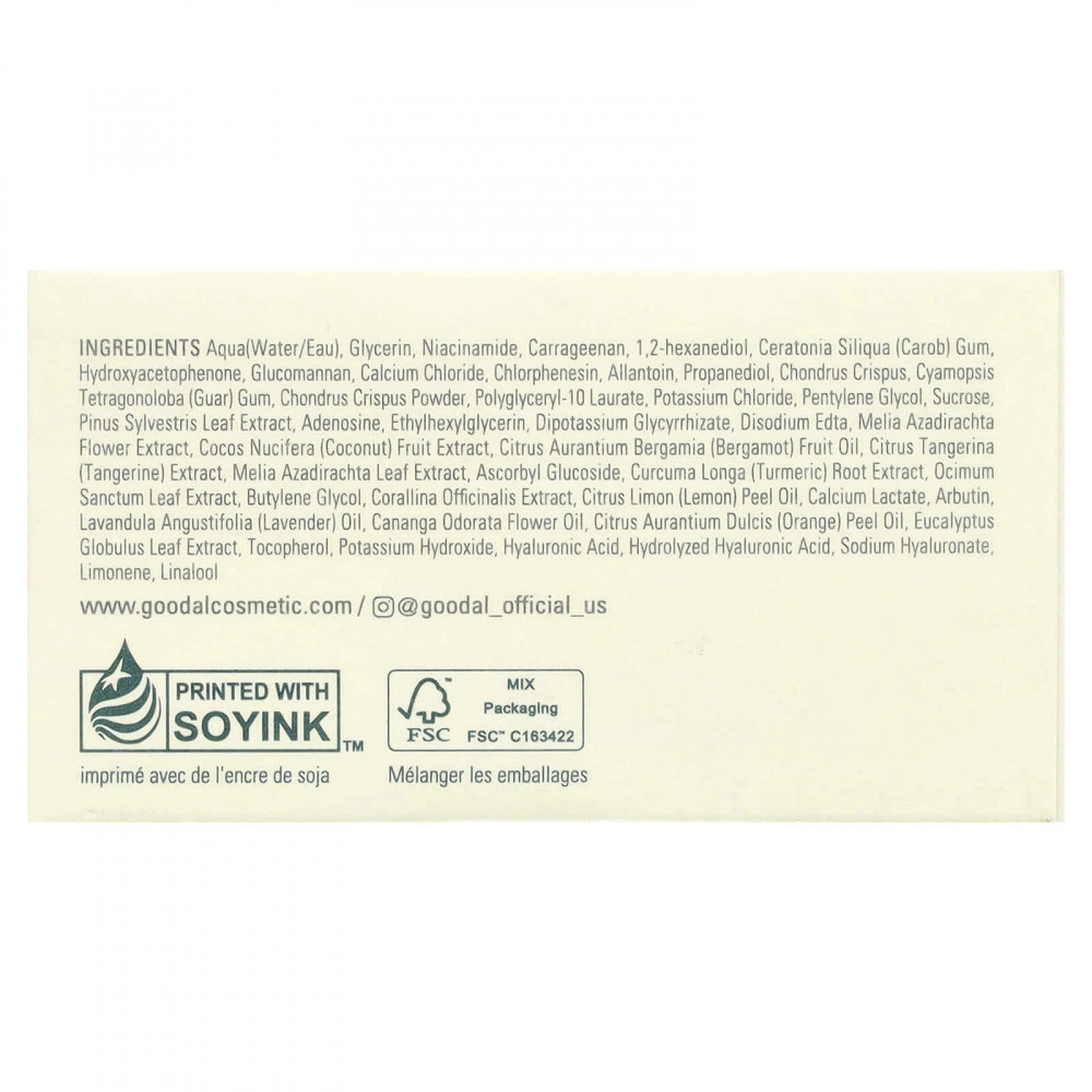 Вода, глицерин, никотинамид, каррагинан, 1,2-гександиол, камедь рожкового дерева (Ceratonia siliqua), гидроксиацетофенон, глюкоманнан, хлорид кальция, хлорфенезин, аллантоин, пропандиол, Chondrus crispus, гуаровая камедь (Cyamopsis tetragonoloba), порошок из ирландского мха (Chondrus crispus), полиглицерил-10 лаурат, хлорид калия, пентилен гликоль, сахароза, экстракт хвои сосны (Pinus sylvestris), аденозин, этилгексилглицерин, дикалия глицирризат, двунатриевая ЭДТК, экстракт цветков дерева ним (Melia azadirachta), экстракт кокоса (Cocos nucifera), масло бергамота (Citrus aurantium bergamia), экстракт мандарина (Сitrus tangerina), экстракт листьев дерева ним (Melia azadirachta), аскорбил глюкозид, экстракт корня куркумы (Curcuma longa), экстракт листьев туласи (Ocimum sanctum), бутиленгликоль, экстракт кораллины лекарственной (Corallina officinalis), масло из цедры лимона (Citrus limon), лактат кальция, арбутин, лавандовое масло (Lavandula angustifolia), масло из цветков иланг-иланга (Cananga odorata), масло из цедры апельсина (Citrus aurantium dulcis), экстракт листьев эвкалипта шаровидного (Eucalyptus globulus), токоферол, гидроксид калия, гиалуроновая кислота, гидролизованная гиалуроновая кислота, гиалуронат натрия, лимонена, линалоол.