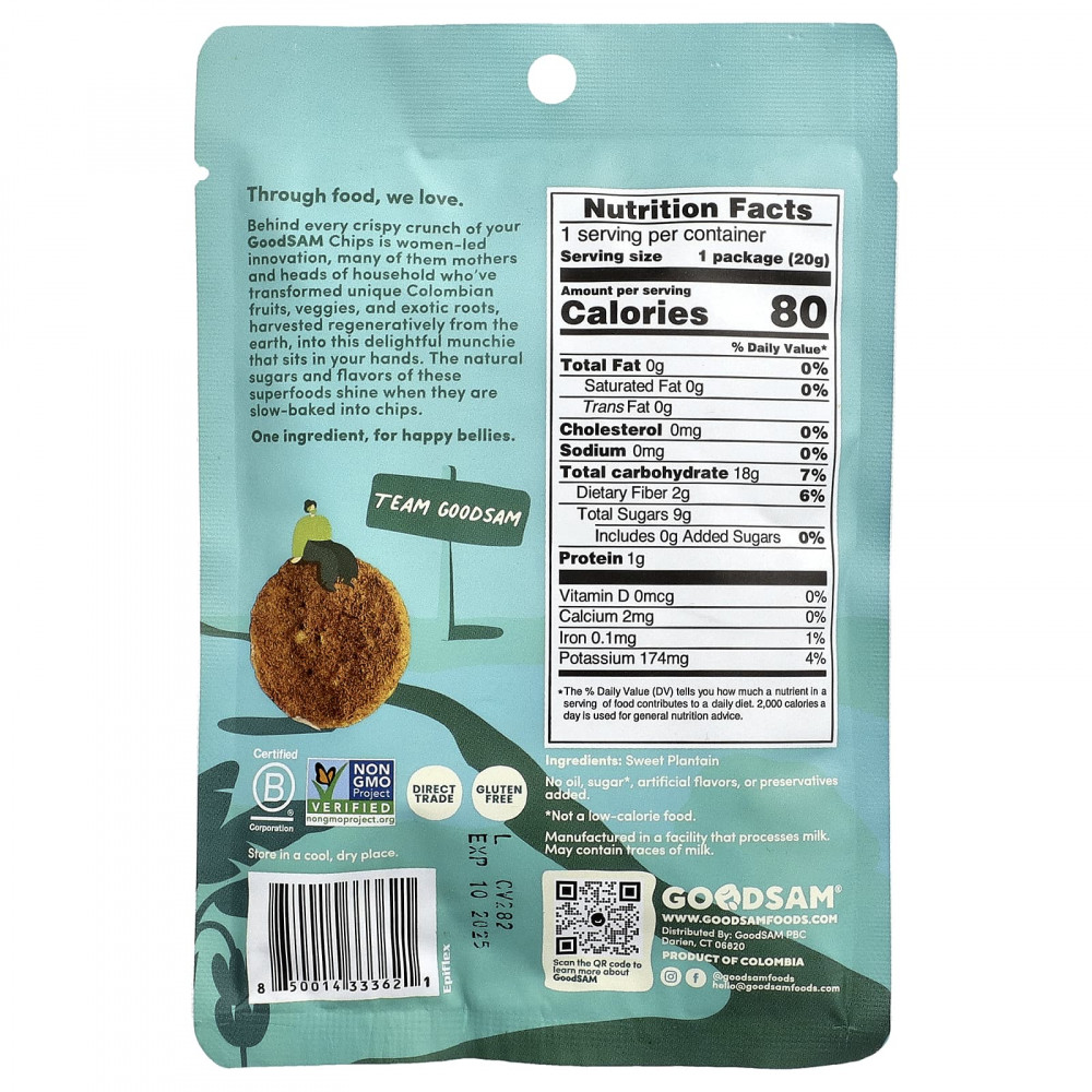 За каждым хрустящим хрустящим чипсом GoodSAM стоит инновация, созданная женщинами. Многие из них — матери и головы, которые превратили уникальные колумбийские фрукты, овощи и экзотические корнеплоды, собранные регенеративным способом из земли, в это восхитительное лакомство, которое готово к употреблению руки. Натуральные сахара и ароматизаторы этих суперфудов сияют, когда из них выпекают чипсы.