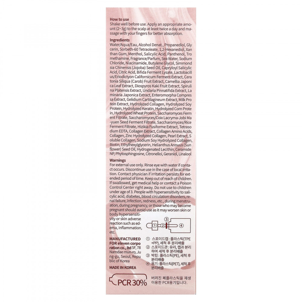 Вода, денатурированный спирт, пропандиол, глицерин, сорбет-60 тетраолеат, 1,2-гександиол, ксан, чем камедь, ментол, салициловая кислота, пантенол, трометамин, отдушка (парфюмерная композиция), морская вода, хлорид натрия, никотинамид, бутиленгликоль, масло из семян жожоба (Simmondsia chinensis), каприлоил салициловой кислоты, лимонная кислота, лизат ферментов бифидобактерий, экстракт ферментированного лактобактериями эриодиктиона (Lactobacillus/Eriodictyon californicum), экстракт плодов рожкового дерева (Cera tonia siliqua), экстракт листьев камелии японской (Camellia japonica), экстракт плодов хурмы восточной (Diospyros kaki), экстракт спирулины (Spirulina platensis), экстракт ундарии перистой (Undaria pinnatifida), экстракт ламинарии японской (Laminaria japonica), экстракт энтероморфы компрессы (Enteromorpha compressa), экстракт агарофита (Gelidium cartilagineum), экстракт молочного белка, гидролизованный коллаген, гидролизованный белок из сои, гидролизованный кератин, гидролизованный кукурузный белок, гидролизованный протеин из пшеницы, продукт ферментации дрожжевых грибков-сахаромицетов, фильтрат закваски семян сахаромицетов / Coix lacryma-jobi mayuen, сахаромицеты / ферментированный фильтрат риса, экстракт хидзики (Hizikia fusiforme), тетранатрия ЭДТК, экстракт коллагена, коллагеновые аминокислоты, коллаген, гидролизованный цинком коллаген, экстракт жемчуга, растворимый коллаген, натрий-соевый гидролизованный коллаген, биотин, этилгексилглицерин, масло семян подсолнечника (Helianthus annuus), гидрогенизированный лецитин, керамид NP, фитосфингозин, цитронеллола, гераниола, линалоола.