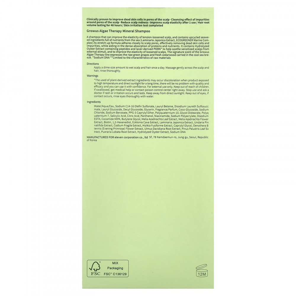 Шампунь, который может повысить эластичность кожи головы с ослабленным натяжением, содержит переработанные морские водоросли и питательные вещества (экстракт ламинарии японской, морской комплекс ECOGREENER). Его формула для растягивания плотно прилегает к порам кожи головы, эффективно удаляя омертвевшие клетки кожи. загрязнений, способствуя плотному усвоению белков и питательных веществ. Он содержит гидролизованный экстракт устрицы, содержащий пептиды, и PDRN * из лавры, которые помогают успокоить чувствительную кожу головы от внешних раздражителей и повысить эластичность ослабленной кожи головы. Фирменный аромат линии Growus Algae Therapy выражается в аромате спелого зеленого винограда и свежего кедра, который дарит прохладный морской бриз.