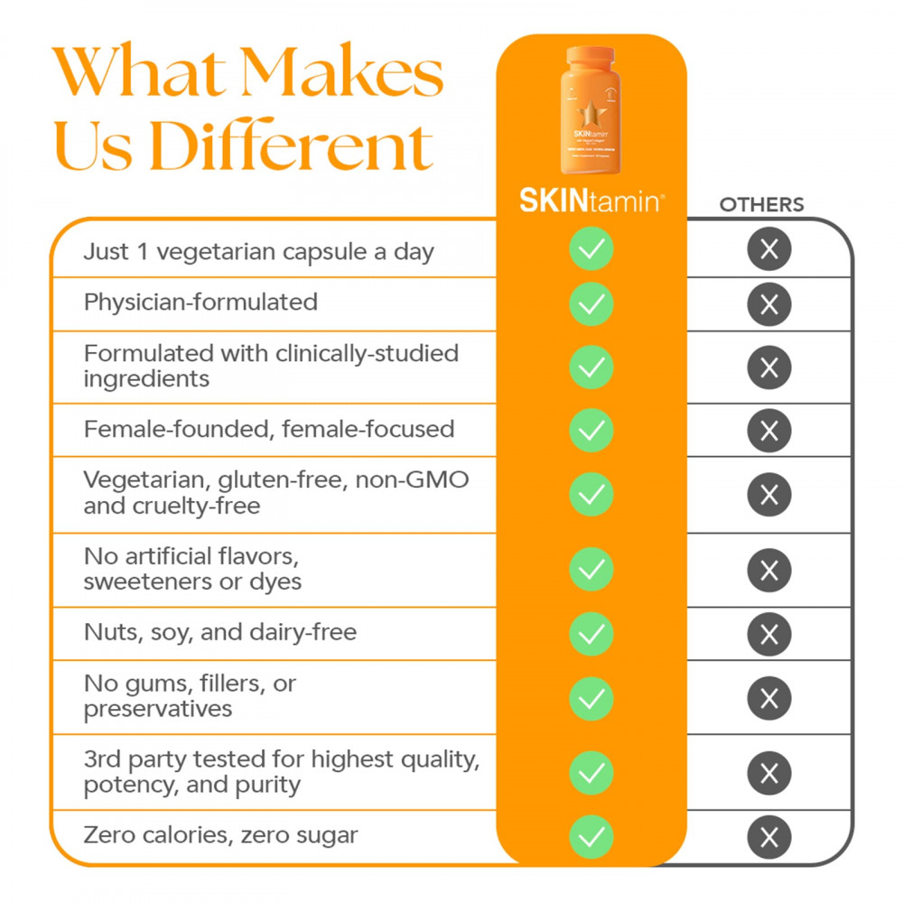 SKINtamin® - это комплексная формула для красоты кожи, которую можно принимать один раз в день, содержит 22 натуральных ингредиента, включая органические плоды амлы, экстракт шафрана, ресвератрол, витамины A, C, E, B12, цинк, гиалуроновую кислоту и наш запатентованный VeggieCollagen® (тип I, V). & X) для гладкой, чистой и молодой кожи изнутри.