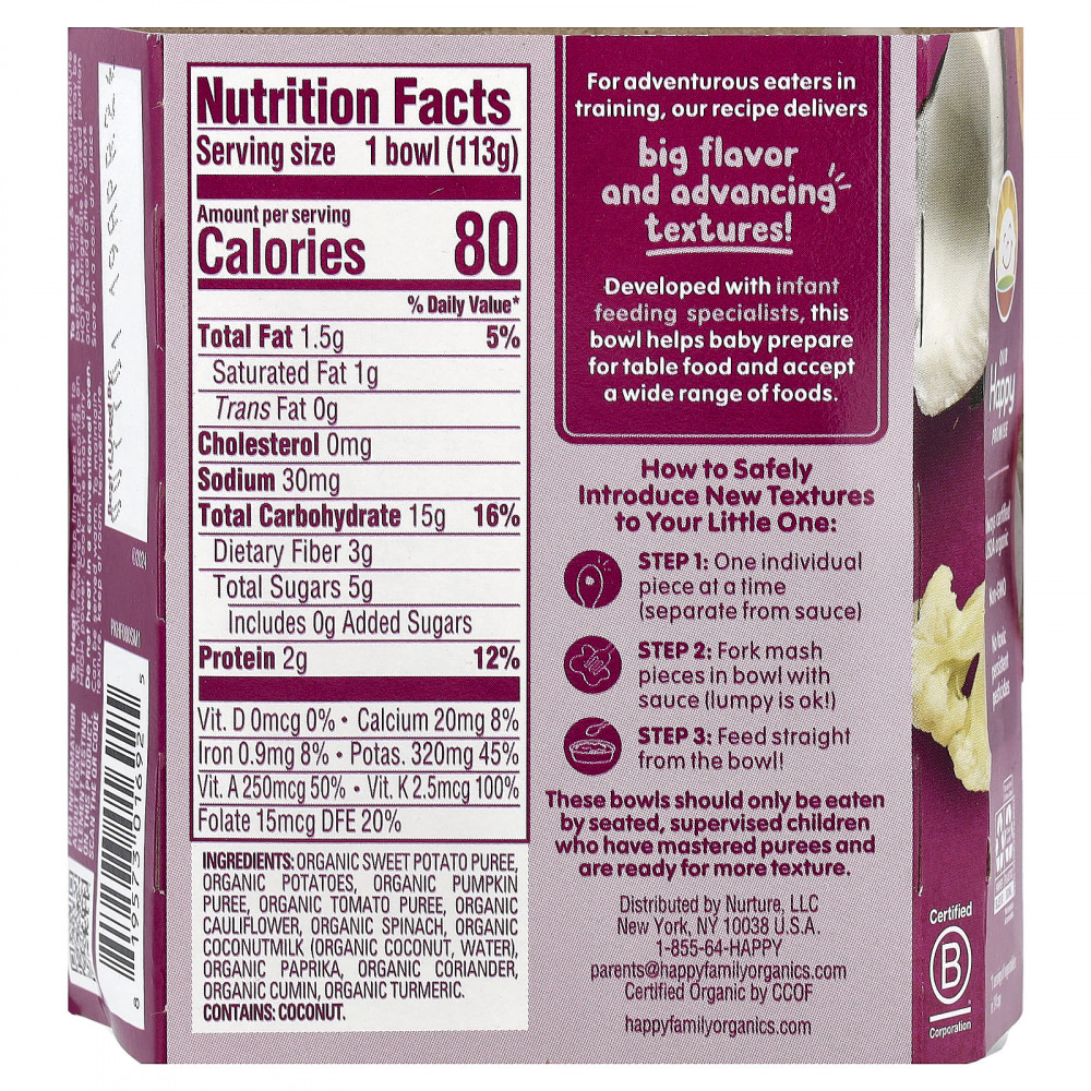 Органическое пюре из батата, органический картофель, органическое тыквенное пюре, органической цветной капусты, вода, органическая томатная паста, органический шпинат, органическое кокосовое молоко, вода), органическая паприка, органический кориандр, органическая зира, органическая куркума.