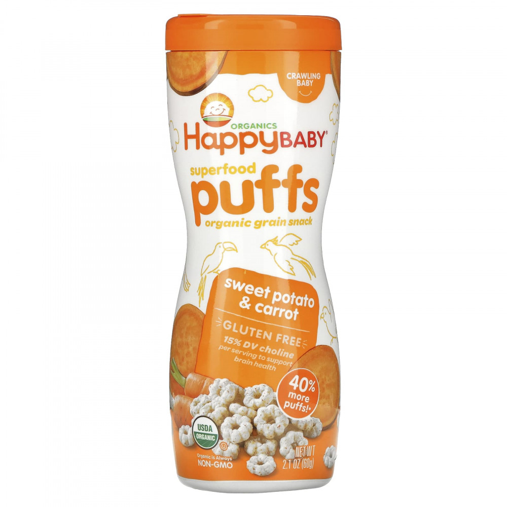 *60 г (2,1 унции) колечек Happy Baby® содержат на 40% больше хрустящих колечек, чем 42 г (1,48 унции) органических колечек Gerber®.
