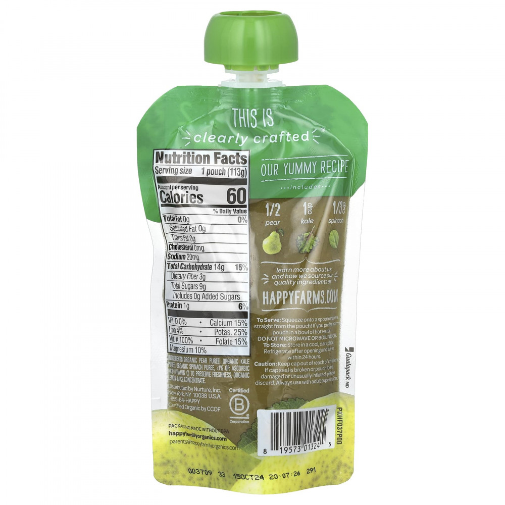 пюре из органической груши, органическое пюре из листовой капусты, пюре из органического шпината, < 1%: Аскорбиновая кислота (витамин C), сохранить свежесть, концентрат органического лимонного сока.