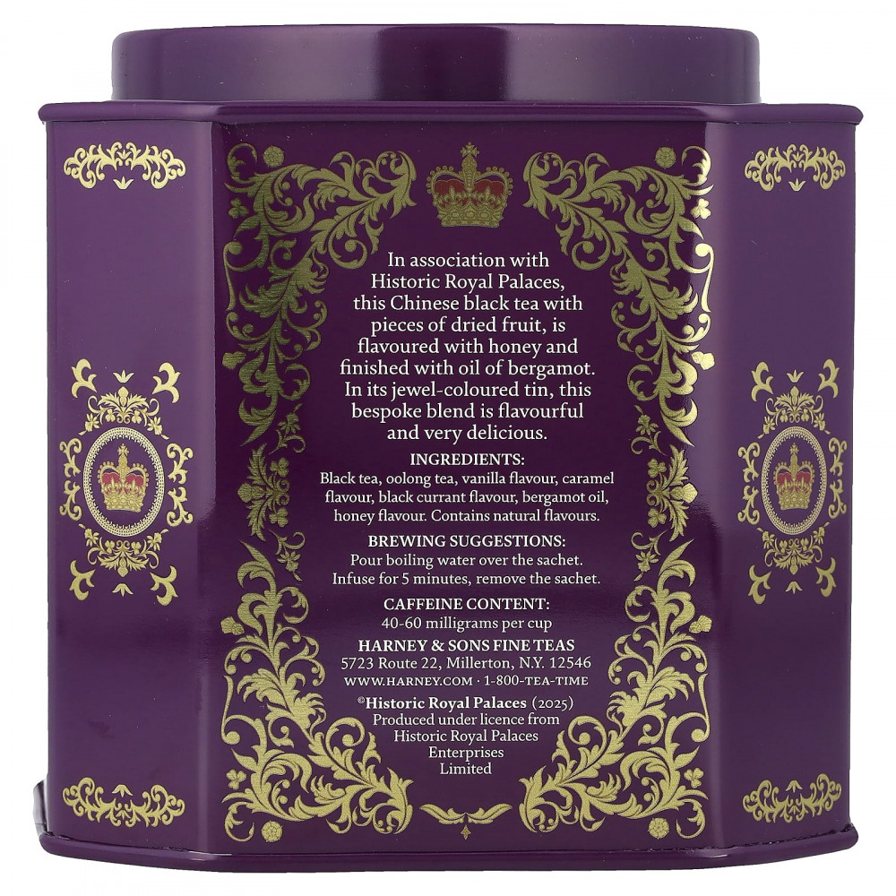 Совместно с Historic Royal Palaces этот китайский черный чай с кусочками сухофруктов ароматизирован медом и маслом бергамота. Эта изготовленная на заказ смесь в ярко-розовой банке — ароматная и очень вкусная.