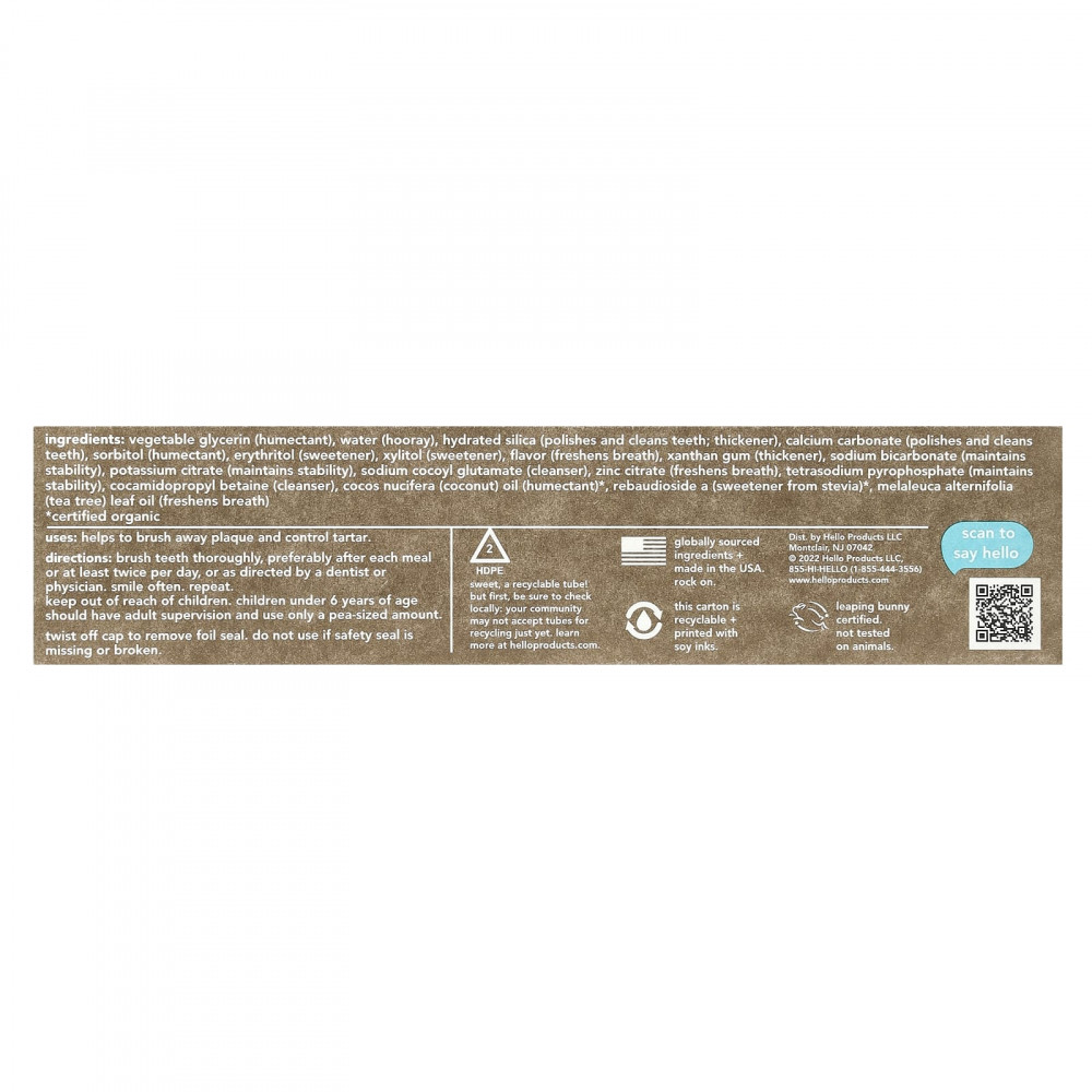 Растительный глицерин (увлажнитель), вода (ура), гидратированный диоксид кремния (полирует и очищает зубы, загуститель), карбонат кальция (полирует и очищает зубы), сорбитол (увлажняющий), эритритол (подсластитель), ксилитол (подсластитель), ароматизатор (освежает дыхание), ксантановая камедь (загуститель), бикарбонат натрия (для поддержания стабильности), цитрат калия (поддерживает стабильность), кокоил глутамат натрия (очищающее средство), цитрат цинка (освежает дыхание), пирофосфат тетранатрия (для поддержания стабильности), кокамидопропилбетаин (очищающее средство), кокосовое масло (Cocos nucifera) (увлажняющее средство)*, ребаудиозид A (подсластитель из стевии)*, масло из листьев чайного дерева (Melaleuca alternifolia) (для освежения дыхания).