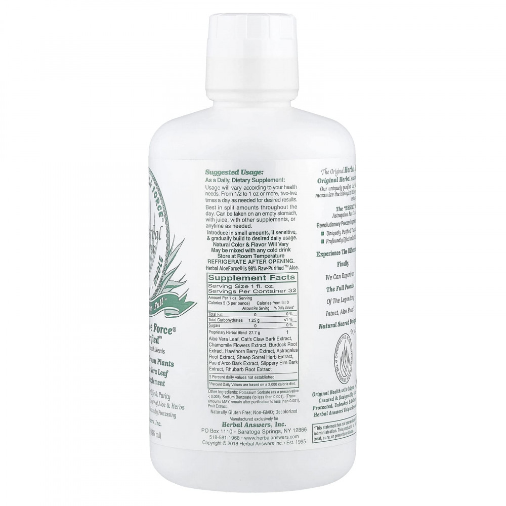 Оригинальная формула Herbal Aloe Force® - это оригинальный травяной ответ для простого здоровья.™ Наше уникально очищенное «Живое» алоэ™, обработанное так, чтобы оставаться «неповрежденным», чтобы максимизировать биологическую доставку его собственных глубоких свойств, а также этих мощных трав: