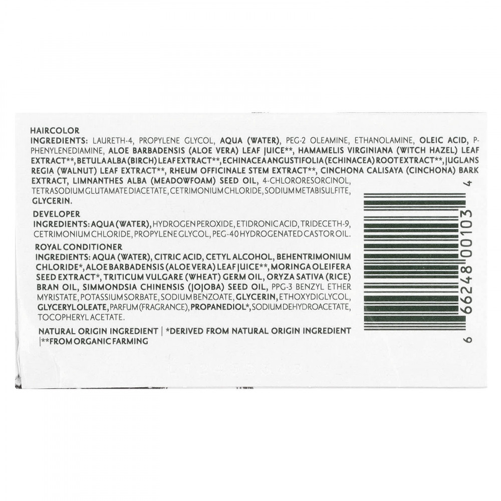 Ингредиенты краски для волос: лаурет-4, пропиленгликоль, вода (Aqua), ПЭГ-2 олеамин, этаноламин, олеиновая кислота, п-фенилендиамин, сок листьев алоэ вера (Aloe barbadensis)**, экстракт листьев гамамелиса (Hamamelis virginiana)**, экстракт листьев берёзы (Betula alba)**, экстракт корня эхинацеи узколистной (Echinacea angustifolia)**, экстракт листьев грецкого ореха (Juglans regia)**, экстракт стеблей ревеня лекарственного (Rheum officinale)**, экстракт коры хинного дерева (Cinchona calisaya), масло из семян пенника лугового (Limnanthes alba), 4-хлорорезорцин, диацетат глутамата тетранатрия, цетримония хлорид, метабисульфит натрия, глицерин.