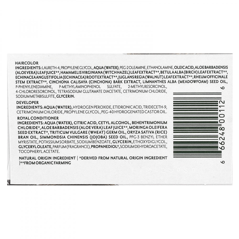 Цвет волос: лаурет-4, пропиленгликоль, вода, ПЭГ-2 олеамин, этаноламин, олеиновая кислота, сок листьев алоэвера (Aloebarbadensis) **, экстракт листьев гамамелиса (Witchhazel) **, экстракт листьев березы (Betulaalba) ** Экстракт корня эхинацеи (Echinacea) **, экстракт листьев грецкого ореха **, экстракт стеблей ревматоидного артрита **, экстракт коры хинного дерева (Cinchona calisaya), масло из семян пенника лугового (Limnanthes alba), п-фенилендиамин, 4-метиламинофенол сульфат, 2-метилрезорцин, 4-хлорорезорцин, диацетат глутамата тетранатрия, цетримония хлорид, метабисульфит натрия, глицерин.