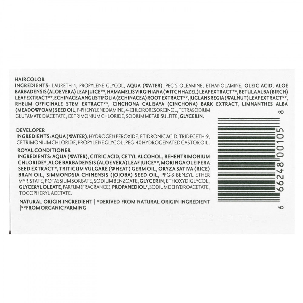 Ингредиенты краски для волос: лаурет-4, пропиленгликоль, вода, ПЭГ-2 олеамин, этаноламин, олеиновая кислота, сок листьев алоэ вера (Aloe barbadensis) **, экстракт листьев гамамелиса (Hamamelis virginiana) **, экстракт листьев березы (Betula alba) **, экстракт корня эхинацеи узколистной (Echinacea angustifolia) **, экстракт листьев грецкого ореха (Juglans regia) **, экстракт стеблей Rheum officinale **, экстракт коры хинного дерева (Cinchona calisaya), масло из семян пенника лугового (Limnanthes alba), п-фенилендиамин, 4-хлорорезорцин, диацетат глутамата тетранатрия, цетримония хлорид, метабисульфит натрия, глицерин.