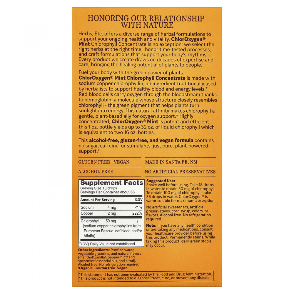 Herbs, Etc. предлагает широкий ассортимент растительных средств для поддержания здоровья и жизненной силы. Концентрат хлорофилла с мятой ChlorOxygen® не является исключением; мы выбираем правильные травы в нужное время, соблюдаем проверенные временем процессы и разрабатываем формулы, поддерживающие ритмы вашего организма. Каждый продукт, который мы создаем, основан на десятилетиях экспертных знаний и заботы, предоставляя людям целебный потенциал растений.