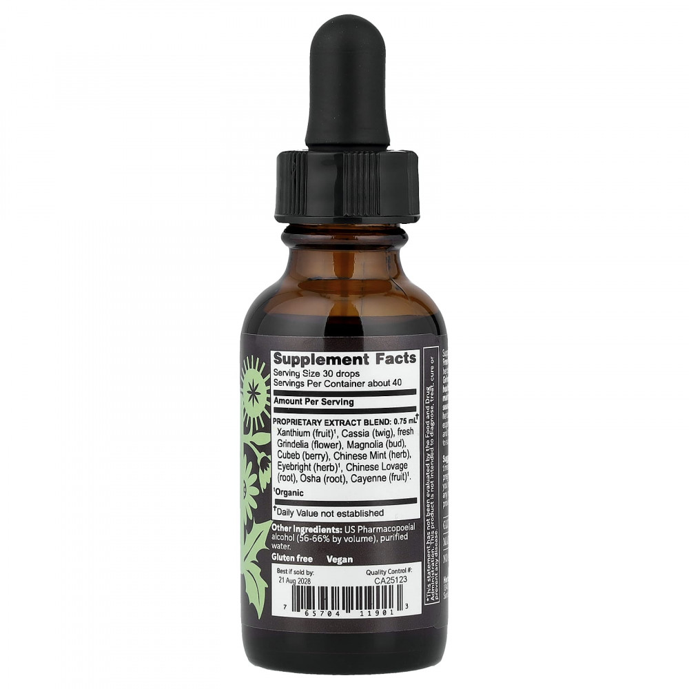 | Запатентованная смесь экстрактов Ксантиум (плод) 1 , кассия (ветвь), свежая гринделия (цветки), магнолия (бутон), кубеба (ягоды), китайская мята (трава), очанка (трава) 1 , корень любистка китайского, корень оливы (корень), кайенский перец (плоды) 1 . | 0,75 мл | † |