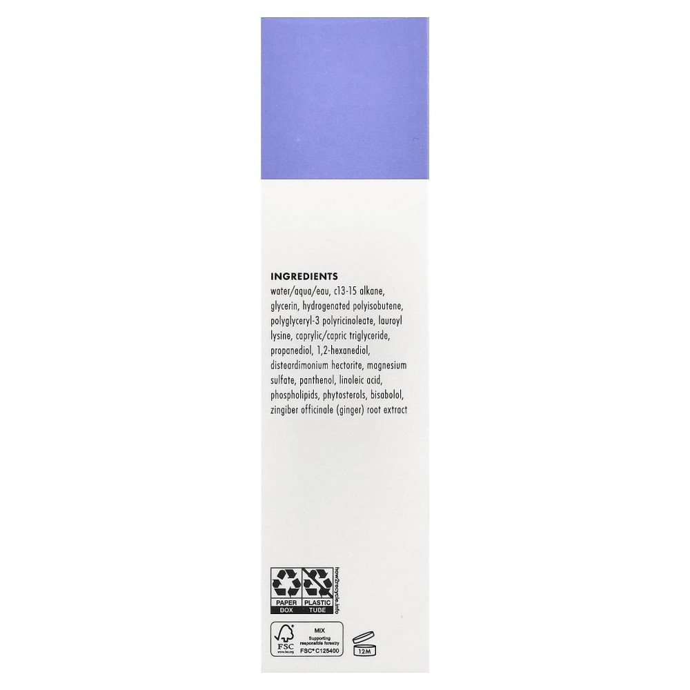 Вода (eau), c13-15 алкан, глицерин, гидрогенизированный полиизобутен, полиглицерил-3 полирицинолеат, лаурил лизин, каприловый/каприновый триглицерид, пропандиол, 1,2-гександиол, дистеардимония гекторит, сульфат магния, пантенол, линолевая кислота, фосфолипидов, фитостеролы, бисаболол, экстракт корня имбиря (Zingiber officinale).