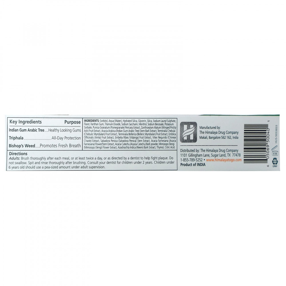 | Сорбитол, вода, гидратированный диоксид кремния, глицерин, диоксид кремния, лаурилсульфат натрия, ароматизатор, ксантановая камедь, диоксид титана, сахарин натрия, ментол, бензоат натрия, сорбат калия, экстракт перикарпа (Punica granatum) ясень), экстракт плодов аравийской акации (гуммиарабика), экстракт плодов чебуличного миробалана (Terminalia chebula), экстракт плодов беллерика миробалан (Terminalia bellerica), экстракт плодов амлы (Emblica officinalis), экстракт плодов виданги (Embelia ribes) экстракт витекса японской (Vitex negundo), экстракт стеблей сальвадора персика (Salvadora persica), экстракт цветков / стеблей акации (Acacia farnesiana), порошок из коры акации катеховой (Acacia catechu), экстракт цветков мимосопса еленги (Mimosops elengi), азадирахта индийская (Azadirachta indica) ним) экстракт коры, тимол, лимонная кислота. | |