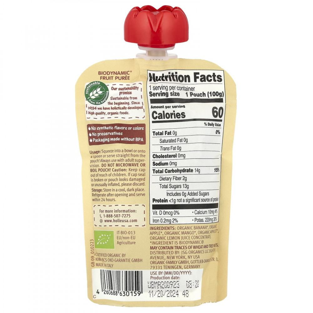Органический банан *, органическое яблоко *, органическое манго *, органический абрикос *, органический концентрат лимонного сока.