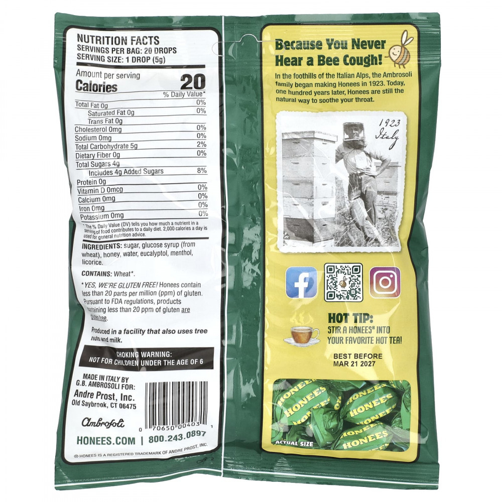 В предгорьях итальянских Альп семья Амброзоли начала производить леденцы Honees в 1923 г. Сегодня, сто лет спустя, мёд по-прежнему остаётся естественным средством, помогающим успокоить боль в горле.