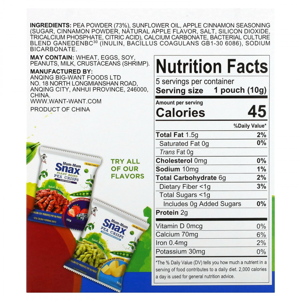 Гороховый порошок (73%), подсолнечное масло, приправа «Яблоко и корица» (сахар, корица молотая, натуральный ароматизатор «Яблоко», соль, диоксид кремния, трикальцийфосфат, лимонная кислота), карбонат кальция, смесь бактериальных культур ganedenbc30 (инулин, бактерии бациллус коагуланс (Bacillus coagulans) gb1-30 6086), бикарбонат натрия.