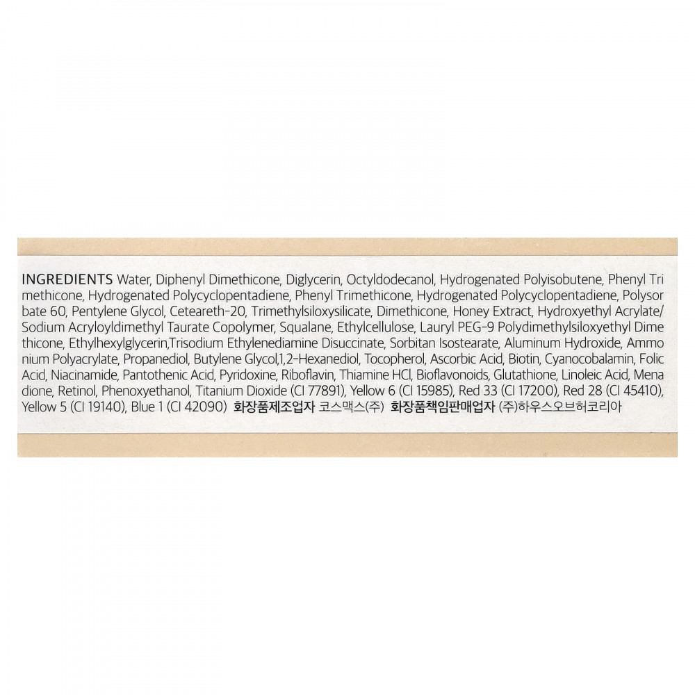 Вода, дифенил диметикон, диглицерин, октилдодеканол, гидрогенизированный полиизобутен, фенилтриметикон, гидрогенизированный полициклопентадиен, полисорбат 60, пентилен гликоль, цетеарет-20, триметилсилоксисиликат, диметикон, экстракт меда, гидроксиэтил акрилат/натрия акрилоилдиметилтаурата сополимер, сквалан, этилцеллюлоза, лаурил ПЭГ-9 полидетилсилоксиэтил диметикон, этилгексилглицерин, тринатрия этилендиамин дисукцинат, сорбитан изостеарат, гидроксид алюминия, полиакрилат аммония, пропандиол, бутиленгликоль, 1,2-гександиол, токоферол, аскорбиновая кислота, биотин, цианокобаламин, фолиевая кислота, никотинамид, пантотеновая кислота, пиридоксин, рибофлавин, тиамина гидрохлорид, биофлавоноиды, глутатион, линолевая кислота, менадион, ретинол, феноксиэтанол, диоксид титана (CI 77891), краситель желтый 6 (CI 15985), краситель красный 33 (CI 17200), краситель красный 28 (CI 45410), краситель жёлтый 5 (CI 19140), краситель синий 1 (CI 42090).