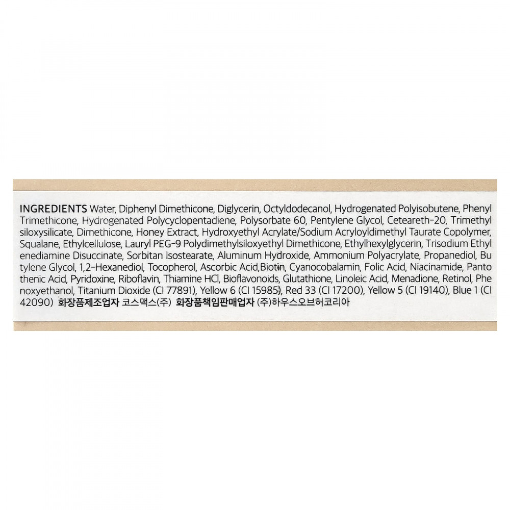 Вода, дифенил диметикон, диглицерин, октилдодеканол, гидрогенизированный полиизобутен, фенилтриметикон, гидрогенизированный полициклопентадиен, полисорбат 60, пентилен гликоль, цетеарет-20, триметилсилоксисиликат, диметикон, экстракт меда, гидроксиэтил акрилат/натрия акрилоилдиметилтаурата сополимер, сквалан, этилцеллюлоза, лаурил ПЭГ-9 полидетилсилоксиэтил диметикон, этилгексилглицерин, тринатрия этилендиамин дисукцинат, сорбитан изостеарат, гидроксид алюминия, полиакрилат аммония, пропандиол, бутиленгликоль, 1,2-гександиол, токоферол, аскорбиновая кислота, биотин, цианокобаламин, фолиевая кислота, никотинамид, пантотеновая кислота, пиридоксин, рибофлавин, тиамина гидрохлорид, биофлавоноиды, глутатион, линолевая кислота, менадион, ретинол, феноксиэтанол, диоксид титана (CI 77891), краситель желтый 6 (CI 15985), краситель красный 33 (CI 17200), краситель жёлтый 5 (CI 19140), краситель синий 1 (CI 42090).