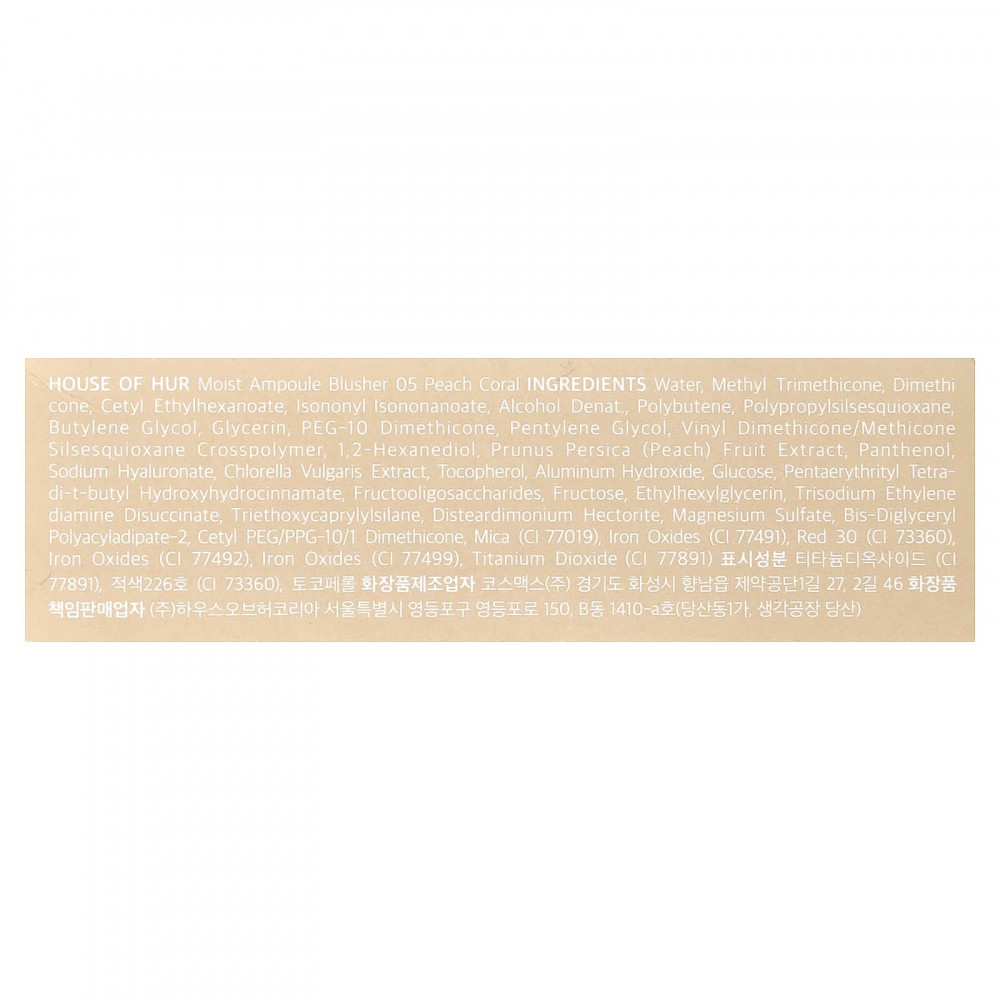 Вода, метилтриметикон, диметикон, цетилэтилгексаноат, изононил изононаноат, денатурированный спирт, полибутен, полипропилсилсесквиоксан, бутиленгликоль, глицерин, ПЭГ-10 диметикон, пентилен гликоль, винил диметикон/метикон силсесквиоксан кроссполимер, 1,2-гександиол, экстракт персика (Prunus persica), пантенол, гиалуронат натрия, экстракт хлореллы (Chlorella vulgaris), токоферол, гидроксид алюминия, глюкоза, пентаэритритил тетра-ди-трет-бутил гидроксигидроциннамат, фруктоолигосахариды, фруктоза, этилгексилглицерин, тринатрия этилендиамин дисукцинат, триэтоксикаприлилсилан, дистеардимония гекторит, сульфат магния, бис-диглицерил полиациладипат-2, цетил ПЭГ/ППГ-10/1 диметикон, слюда (CI 77019), оксиды железа (CI 77491), краситель красный 30 (CI 73360), оксиды железа (CI 77492), оксиды железа (CI 77499), диоксид титана (CI 77891).