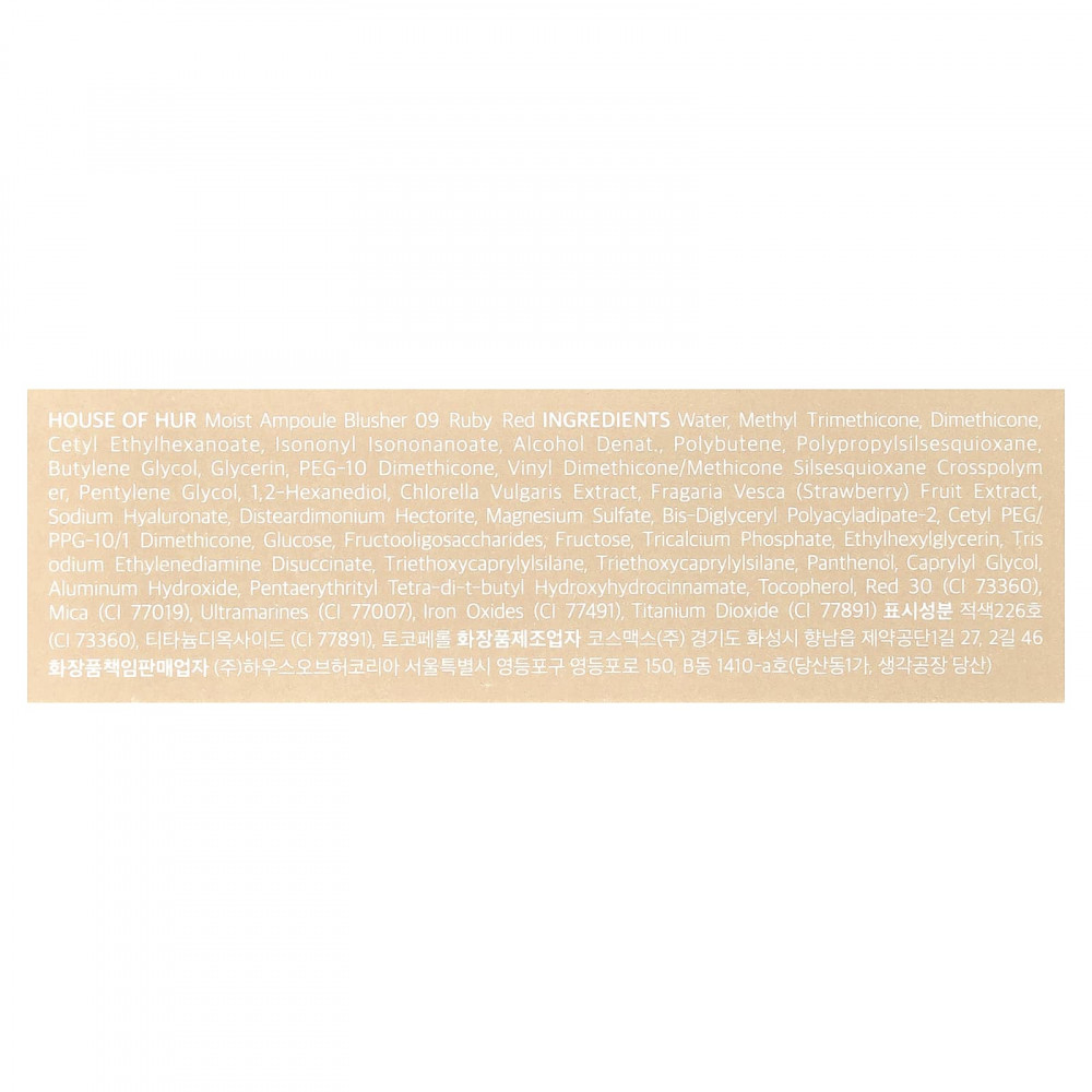 Вода, метилтриметикон, диметикон, цетилэтилгексаноат, изононил изононаноат, денатурированный спирт, полибутен, полипропилсилсесквиоксан, бутиленгликоль, глицерин, ПЭГ-10 диметикон, винил диметикон/метикон силсесквиоксан кроссполимер, пентилен гликоль, 1,2-гександиол, экстракт хлореллы (Chlorella vulgaris), экстракт клубники (Fragaria vesca), гиалуронат натрия, дистеардимония гекторит, сульфат магния, бис-диглицерил полиациладипат-2, цетил ПЭГ/ППГ-10/1 диметикон, глюкоза, фруктоолигосахариды, фруктоза, трикальцийфосфат, этилгексилглицерин, тринатрия этилендиамин дисукцинат, триэтоксикаприлилсилан, триэтоксикаприлилсилан, пантенол, каприлилгликоль, гидроксид алюминия, пентаэритритил тетра-ди-трет-бутил гидроксигидроциннамат, токоферол, краситель красный 30 (CI 73360), слюда (CI 77019), ультрамарины (CI 77007), оксиды железа (CI 77491), диоксид титана (CI 77891).