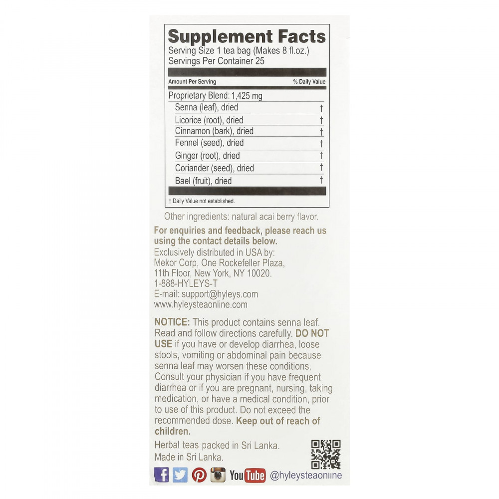 Примечание. Этот продукт содержит листья сенны. Прочитайте инструкцию и четко следуйте ей. Не используйте продукт, если у вас диарея, жидкий стул, рвота или боли в животе, поскольку лист сенны может ухудшить эти состояния. Перед применением в случае частой диареи, во время беременности, кормления грудью, приема каких-либо препаратов или при наличии каких-либо заболеваний следует проконсультироваться с врачом. Не следует превышать рекомендуемую дозировку. Хранить в недоступном для детей месте.