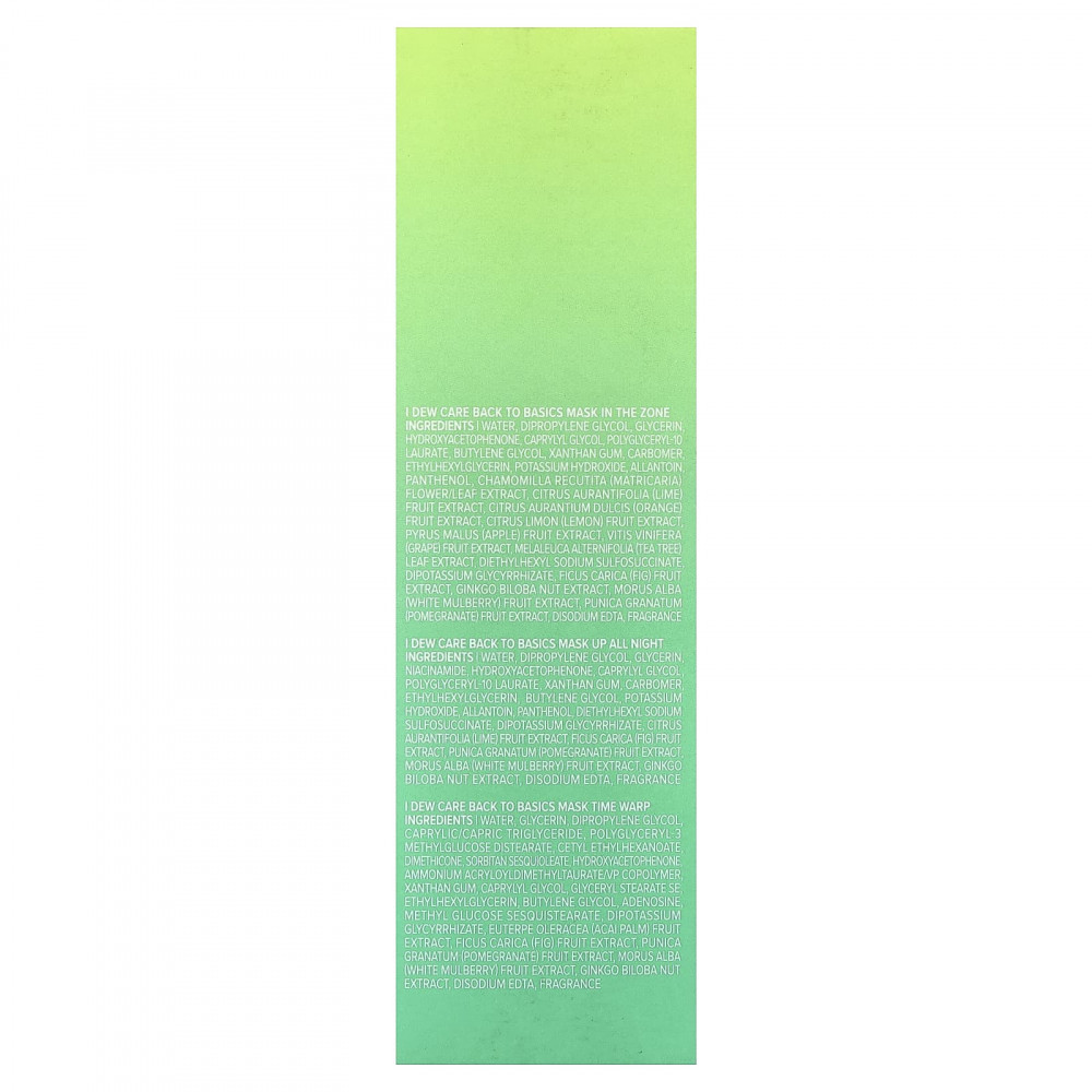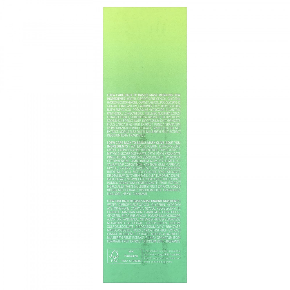 Morning Dew: Вода, дипропиленгликоль, глицерин, гидроксиацетофенон, каприлилгликоль, полиглицерил-10 лаурат, Ксантановая камедь, Карбомер, этилгексилглицерин, бутиленгликоль, едкое кали, Аллантоин, пантенол, 1,2-гександиол, экстракт цветков лотоса орехоносного (Nelumbo nucifera), гиалуронат натрия, диэтилгексил сульфосукцинат натрия, глицирризат дикалия, экстракт плодов инжира (Ficus carica), экстракт плодов граната (Punica granatum), экстракт орехов гинкго билоба (Ginkgo biloba), экстракт плодов белой шелковицы (Morus alba), Динатрия ЭДТА, аромат.
